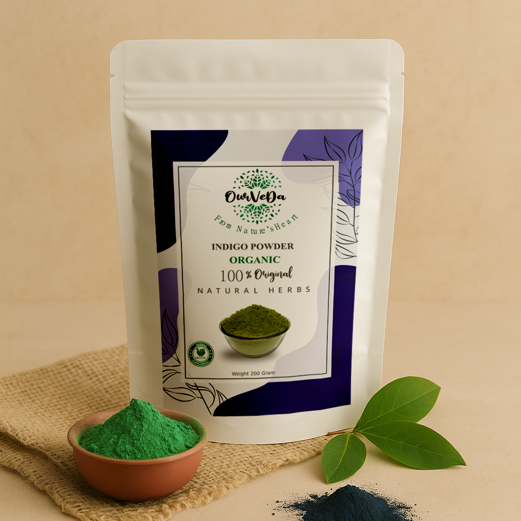 100% Pure Indigo (Indigofera tinctoria) Leaf – a natural hair dye used for deep black and brown tones without chemicals.