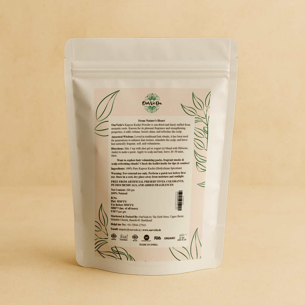 Kapur Kachri is an aromatic root known for its refreshing fragrance and hair-thickening properties. Used traditionally in Ayurvedic hair care, it adds natural volume and shine to hair while promoting scalp health. Ourveda’s Kapur Kachri is carefully dried and powdered to retain its rich essential oils, making it a nourishing addition to any hair mask or oil blend.