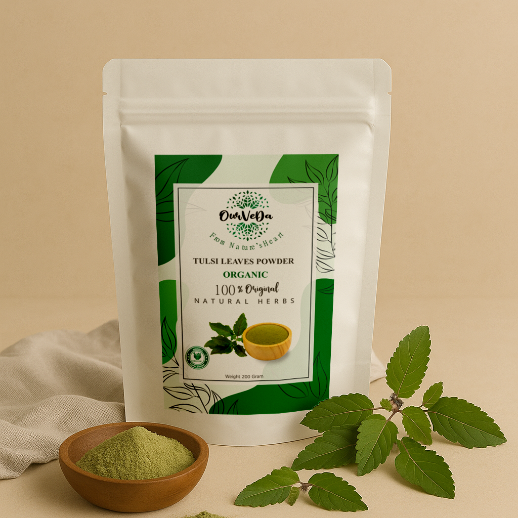 Tulsi, also known as Holy Basil, is a revered herb in Ayurveda for its immune-boosting, stress-relieving, and skin-purifying properties. Ourveda’s Tulsi Leaves are dried and powdered to preserve their rich phytochemicals. It helps clear acne, reduce skin irritation, and enhance overall skin health. Ideal for use in face packs and wellness teas.